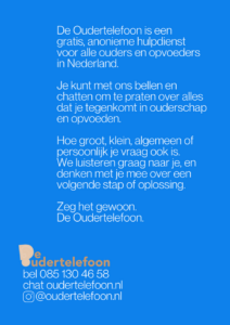 De Oudertelefoon is iedere doordeweekse dag en avond te bereiken via 085 130 46 58 (telefoon) en oudertelefoon.nl (chat).