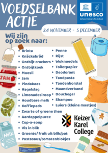 Vanaf maandag 24 november tot en met vrijdag 5 december zamelen wij verschillende, lang-houdbare producten in die jullie op de poster kunnen vinden. Producten kunnen de hele dag worden ingeleverd bij het inzamelingspunt tegenover de balie, waar tijdens de pauzes UNESCO-leden de producten in ontvangst nemen.