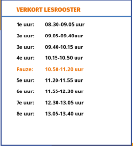 Het verkorte rooster wordt ingezet om minder les-uitval te hebben op de dagen dat wij bijvoorbeeld de leerlingbesprekingen of driehoeksgesprekken hebben ingeroosterd. We kunnen zo wel vrijwel alle lessen geven die normaliter tijdens het 1e t/m 8e lesuur ingepland staan, met een minimale verkorting van de lestijd.
